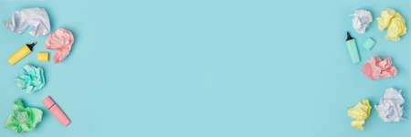 Banner made with colored crumpled paper balls and stationery on blue background. education concept. Flat Lay Top view Still life Copy space.