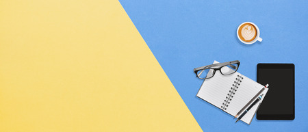 Coffee break, Business, Lifestyle concept, Modern office workspace with vibrant contrast color blue and yellow with tablet, notebook, eyeglasses and cup of hot coffee, Flat lay with copy space