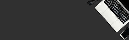Top view of dark modern workspace with laptop computer, smartphone and office supplies
