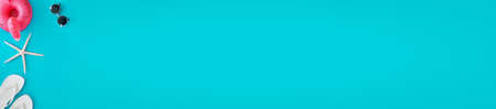 Summer travel concept. Vacation objects flat lay - sunglasses, hat and starfish on creative blue color background, top view. Long banner