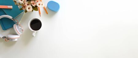 Top view - Business people work space with smartphone, credit card, cookies, coffee, headphone over white background.