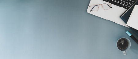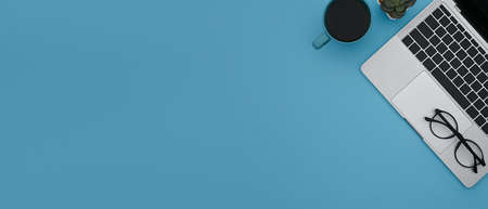 Top view laptop computer, coffee cup and glasses on blue background with copy pace.
