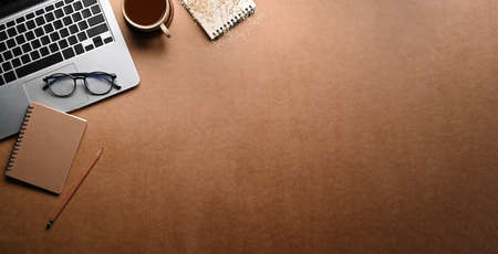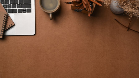 Top view laptop computer, coffee cup and pencil holder on brown background.