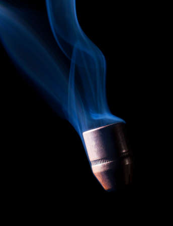 Copper handgun bullet with smoke behind that looks like it is going down