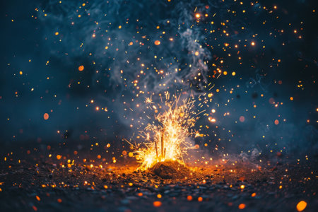A stunning scene showcasing a burst of colorful sparks and fire, illuminating the dark night sky during a vibrant fireworks celebration, filled with energy and excitement.