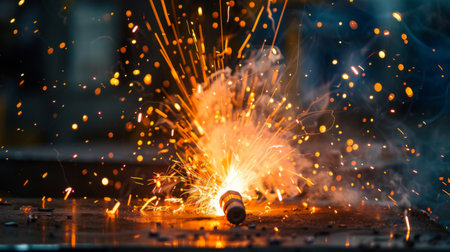 A dramatic explosion of sparks and flames from a welding torch in a workshop.