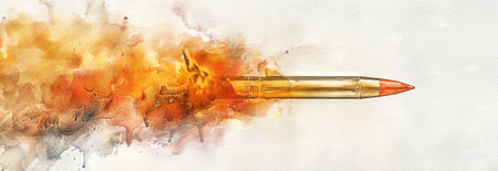 Watercolor illustration of a bullet flying through fires and colorful smoke. Concept of speed, impact, explosion, and dynamic motion in painting. Banner. Banner.