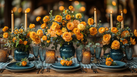 Lush orange and yellow floral arrangements on a rustic wooden table with blue plates, candles, and glassware, creating a warm ambiance