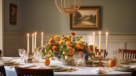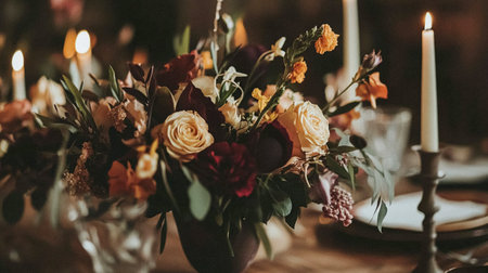 A table with a centerpiece of flowers and candles on it, AI