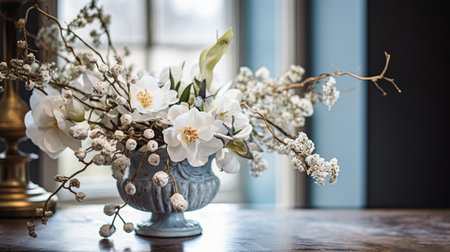 Beautiful floral arrangement with winter, autumn or early spring botanical plants and flowers