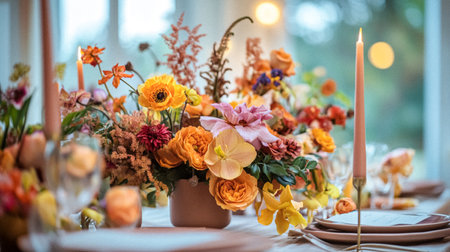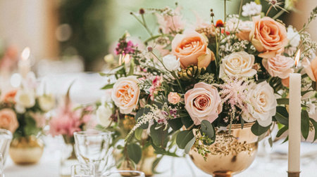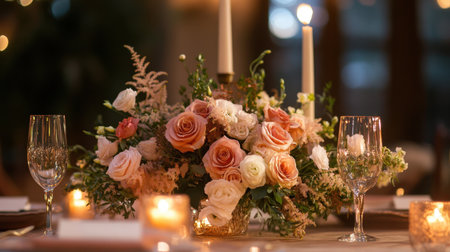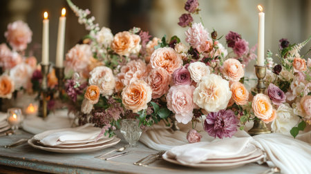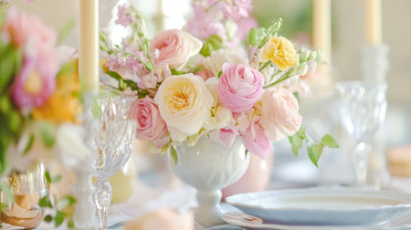Elegant Floral Centerpiece Adorns a Beautifully Set Dining Table for a Special Occasion With Soft Candlelight and Pastel Colors Creating a Romantic Atmosphere Generative AI