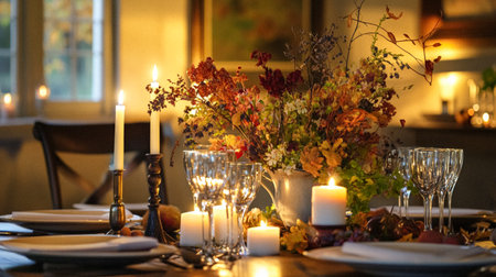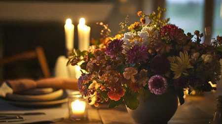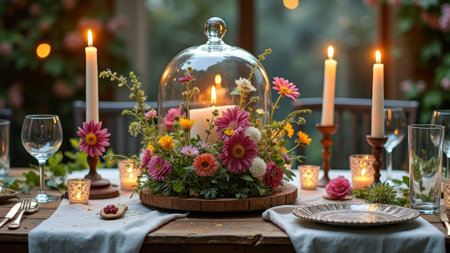 Rustic evening table setting with floral centerpiece and candlelight ambiance. That the image is generated using AI.
