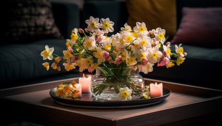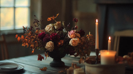 A table with a vase of flowers and candles on it, AI