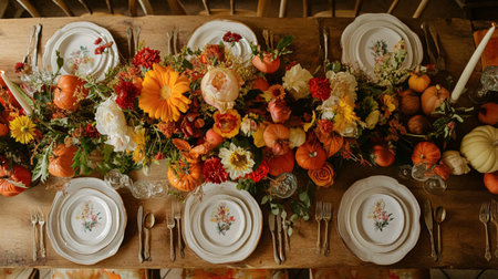 This exquisite table setting features a stunning autumn floral centerpiece adorned with candles and vintage dinnerware, creating a warm and inviting atmosphere for gatherings.