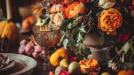 Autumn holiday tablescape, formal dinner table setting, table scape with elegant autumnal floral decor for wedding party and event decoration idea