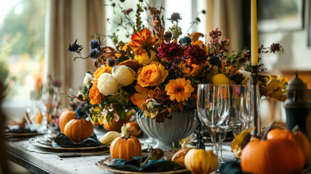 Elegant table arrangement featuring pastel flowers and small pumpkins, with faint blue shadows adding depth.
