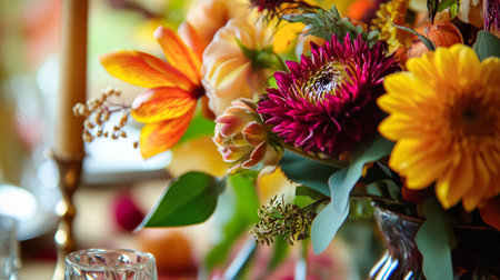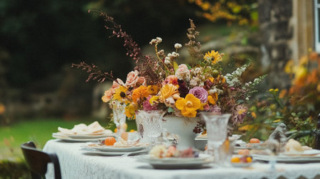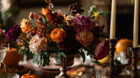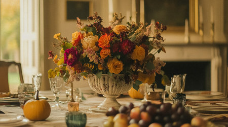 This image captures an elegant autumn table setting adorned with colorful flowers and fresh fruits, complemented by gold tableware, perfect for festive gatherings.