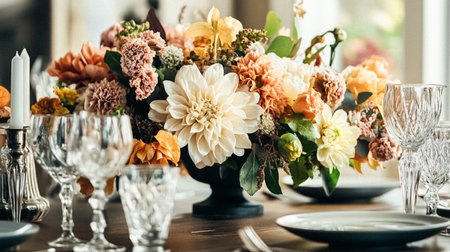 A table with a fancy dinner setting and flowers on it, AI