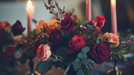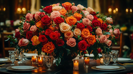 Generative AI Image of Romantic Dinner with Colorful Rose Bouquet and Candles in Restaurant