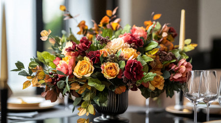 Elegant rose and berry centerpiece at formal dining event with glassware. That the image is generated using AI.
