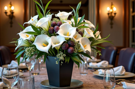 Elegant calla lily and fruit centerpiece on a formal dining table. That the image is generated using AI.