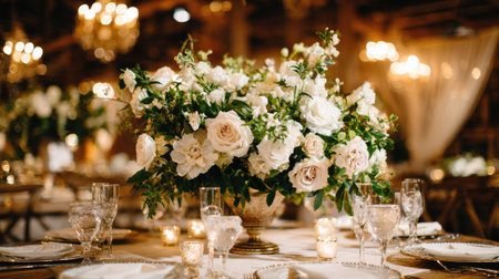 Large, elaborate floral centerpiece, featuring a mix of white and blush-toned roses and greenery, sits on a banquet table with fine dining settings. The table is set with crystal glasses, plates, and lit candles. The ambiance is elegant and sophisticated.