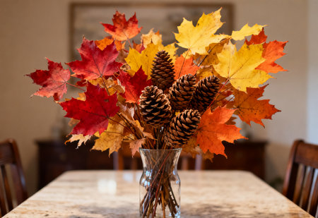 Autumn bouquet with pine cones and maple leaves on a wooden table
