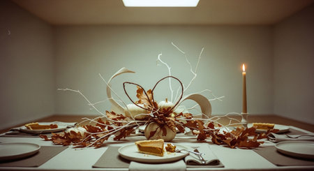 A minimalist dining table set for a fall celebration, featuring a centerpiece of white pumpkins and dried leaves, with plates and slices of cake, softly lit by a candle