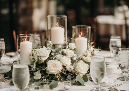 A refined table displays glowing candles within glass holders, accompanied by white roses and greenery. The composition showcases a soft, diffused lighting, creating a warm ambiance. This setting could be utilized for various commercial purposes, including event planning or editorial content related to celebrations.