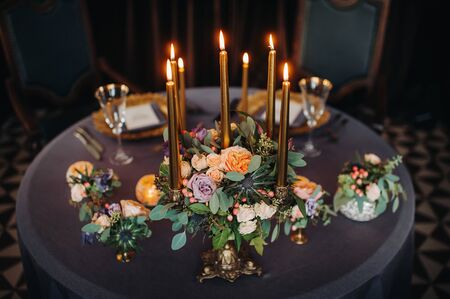 wedding table decoration with flowers on the table in the castle, table decor for dinner by candlelight.Dinner with candles.