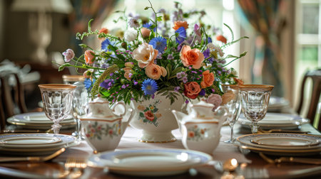 Elegant table setting with fine china and a vibrant floral arrangement