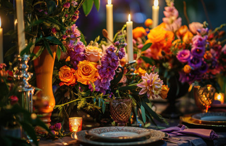 colorful wedding table settings with candles.
