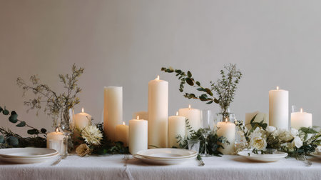 A beautifully arranged table featuring white candles and fresh flowers. Perfect setting for a romantic dinner or special occasion, creating a warm and inviting atmosphere.