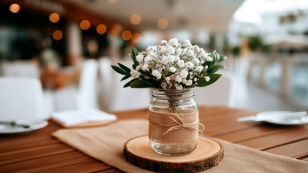 A charming rustic wedding table centerpiece featuring a mason jar filled with delicate baby's breath flowers, wrapped with twine, and placed on a natural wood slice. Perfect for elegant outdoor or barn receptions.