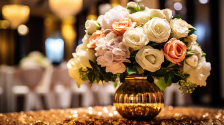 Beautiful luxury wedding floral centerpieces flower bouquet in a vase or pot on the wedding table or as a decoration in a romantic dinner or wedding table reception. Copy space.