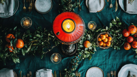 A beautifully arranged holiday table setting featuring glowing candles amidst lush greenery and sparkling ornaments, creating a warm and inviting festive ambiance.