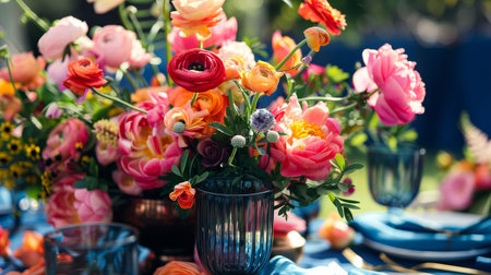 A close-up of a beautifully arranged flower centerpiece on a party table, with colorful blooms and elegant vases