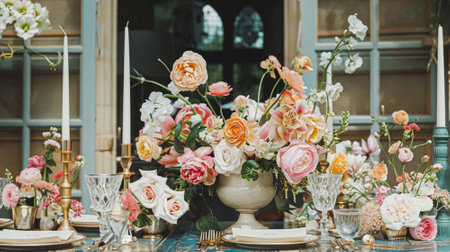 Elegant Floral Centerpiece Adorns a Beautifully Set Dining Table for a Special Occasion With Soft Candlelight and Pastel Colors Creating a Romantic Atmosphere Generative AI