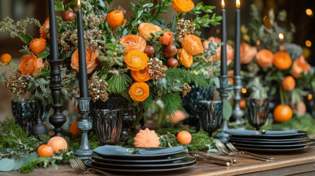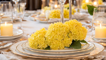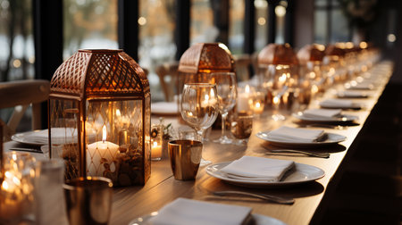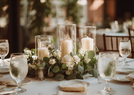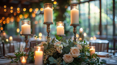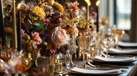 An elegant table setting features candles and floral arrangements, showcasing soft lighting and a warm color palette. The composition includes glassware and decorative elements suggesting a celebratory occasion. Suitable for use in editorial content or commercial applications, this image evokes a sense of refined taste.