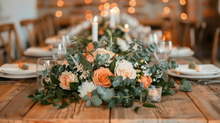Elegant Floral Arrangement on Rustic Table in Warmly Lit Venue During Afternoon Event Showcasing Romantic Ambiance Generative AI