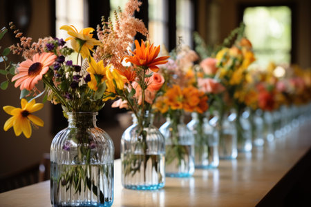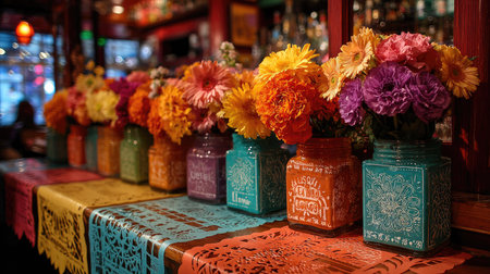 A stunning display of vibrant flower arrangements in artistic jars placed on a table at a lively restaurant, enhancing the joyful ambiance with color.