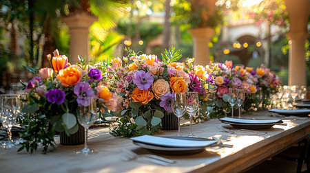 A beautiful spread on a lengthy table includes plates, glasses, and vibrant flowers arranged delicately