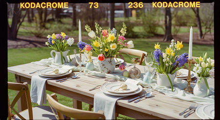 A tablescape with handmade decor and mismatched china, Ai generated image