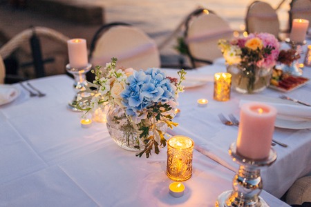 Festive table setting with plates, candles and floral bouquet. Table set for banquet in luxury restaurant