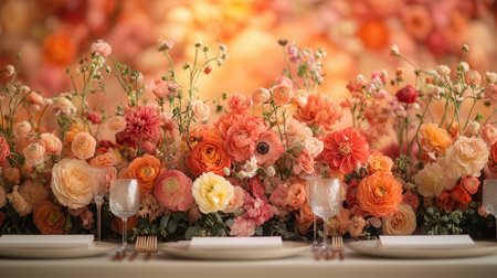 Stunning banquet setting featuring elegant floral centerpieces, exquisite glassware, and a vibrant color palette, perfect for celebrations and events.