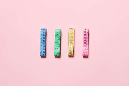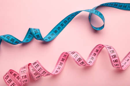 Blue and pink plastic measure tape with metric scale over on color pink background. top view. Diet concept