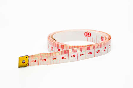 Yellow white tailor tape measure to take measurements and measure, red background