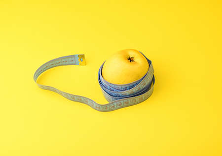 A yellow apple wrapped in a centimeter tape on a yellow background. Diet concept. Copy space, selective focus.