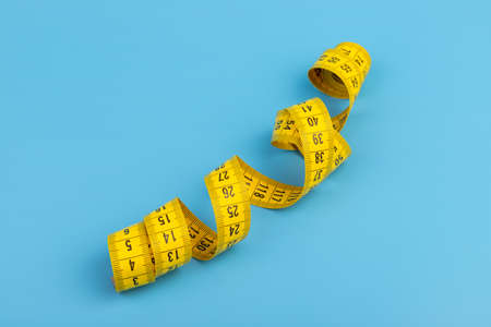 Yellow measuring tape on a blue background. The concept of diet and weight loss.