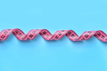 Roll of blue tape measure untwisted on turquoise background with copy space as symbol of weight management